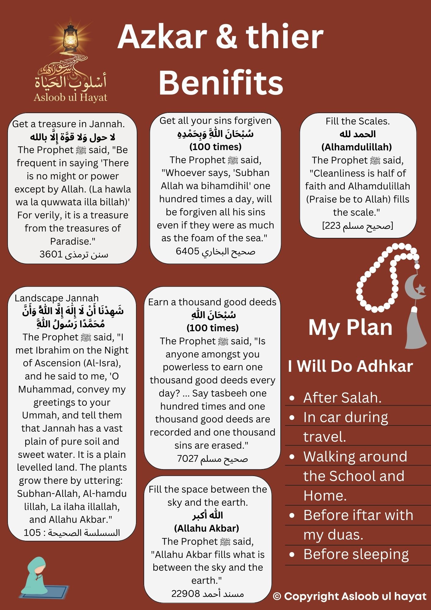 Spiritual Routine Graphics: Images depicting children reading the Quran, making Dua, performing Wudu, or praying.